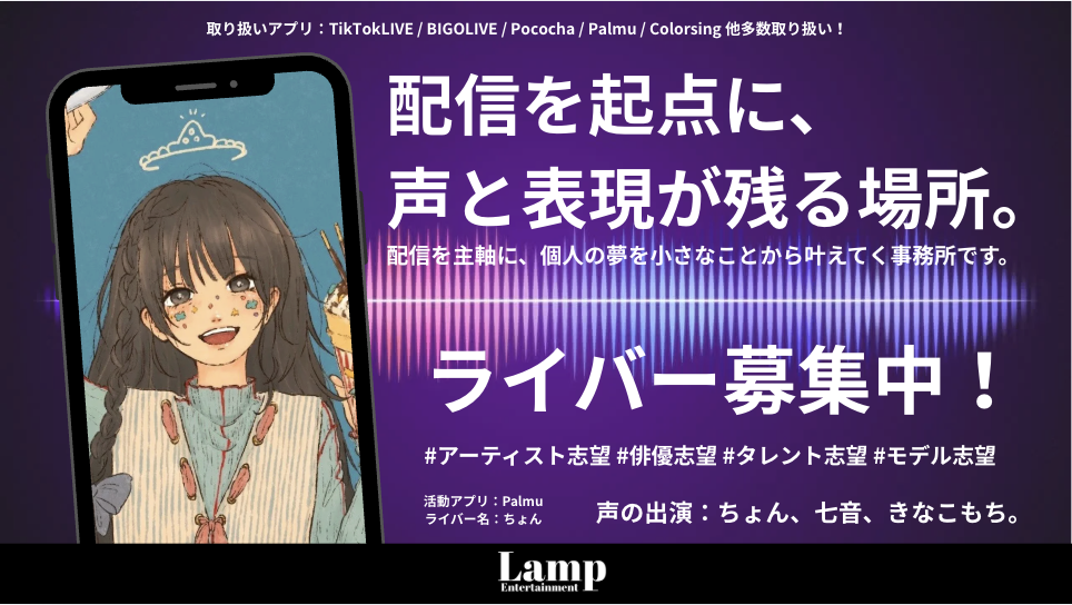 【NEWS】Lamp Voice Contest mini vol.03 ラジオ宣伝広告データ完成By Lamp 公式最新情報 / 2026年2月17日 【BIGOLIVE】春色ピクニック 【BIGOLIVE】...Read More 【Palmu】𝙈𝙧. B帯到達 【Palmu】𝙈𝙧....Read More 【BIGOLIVE】LIVER KIMONO COLLECTION 【BIGOLIVE】...Read More 【Lamp】ZeppFukuoka 最寄り駅 唐人町駅ポスター掲出 【Lamp】Zepp...Read More Load More