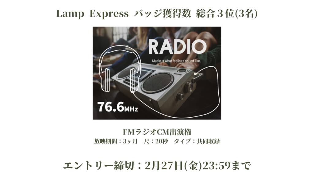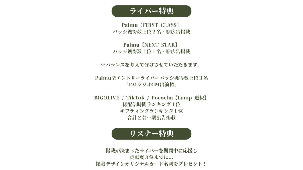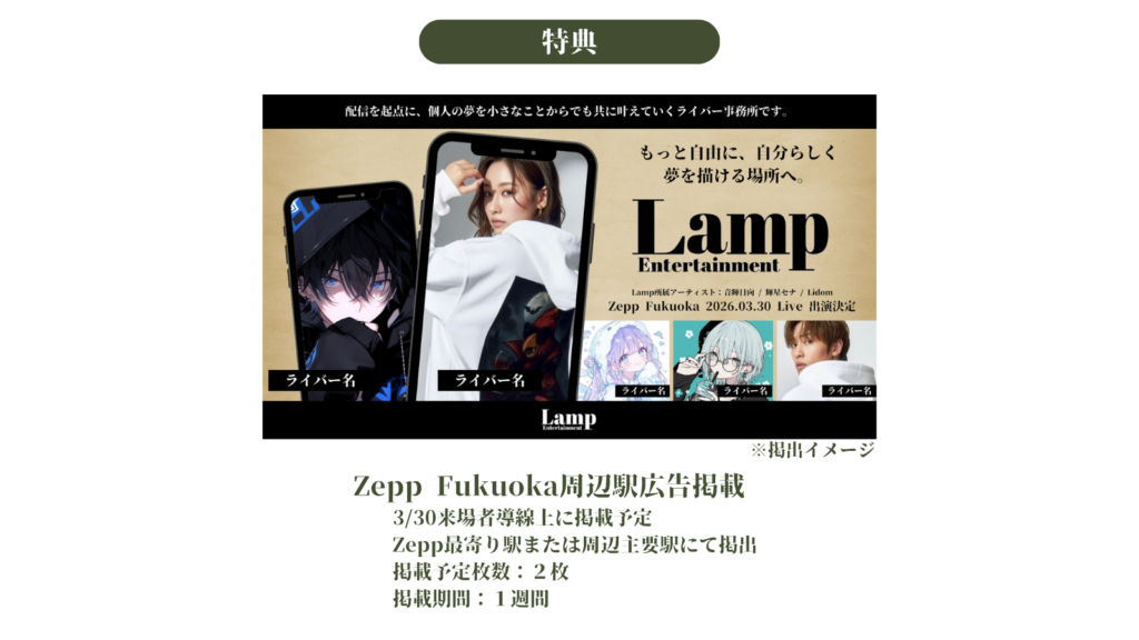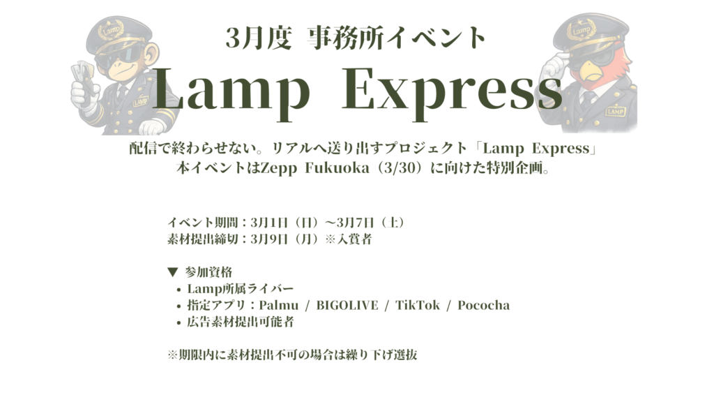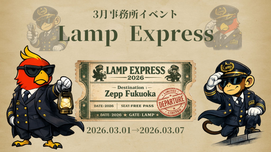 【NEWS】3月のLampイベント情報By Lamp 公式最新情報 / 2026年2月23日 ✨3月事務所イベント情報解禁✨ 今回のイベントはこの豪華4イベント! ・バッジ獲得大作戦!(Palmuライバー限定) ※自動エントリー・Lamp Express (対象アプリ:Palmu / BIGOLIVE / Pococha /TikTokLIVE)・オリジナルパーカー争奪戦・voice contest vol.01 ボイスドラマ編 ▶︎エントリーはこちらから◀︎ 詳細は25日までに順次掲載予定! Lamp Express 【BIGOLIVE】春色ピクニック 【BIGOLIVE】...Read More 【Palmu】𝙈𝙧. B帯到達 【Palmu】𝙈𝙧....Read More 【BIGOLIVE】LIVER KIMONO COLLECTION 【BIGOLIVE】...Read More 【Lamp】ZeppFukuoka 最寄り駅 唐人町駅ポスター掲出 【Lamp】Zepp...Read More Load More